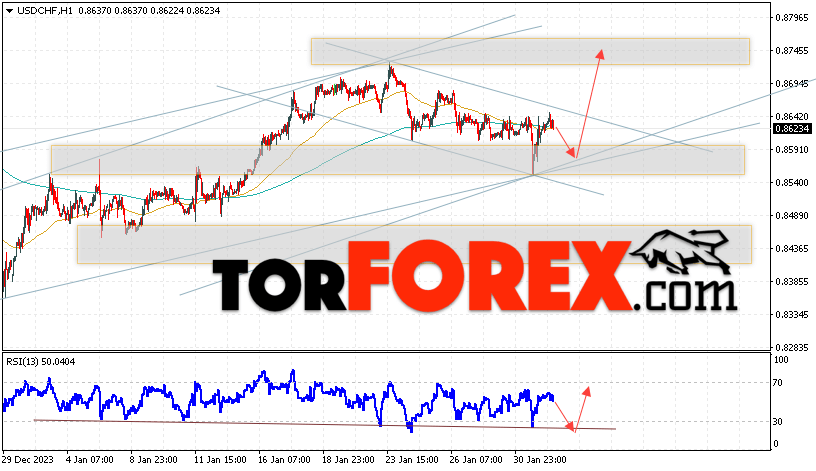 Таким образом, USD/CHF прогноз Доллар Франк на 2 февраля 2024 предполагает попытку развития коррекции и теста области поддержки вблизи уровня 0.8575. Далее, продолжение роста валютной пары USD/CHF с целью выше уровня 0.8745. Дополнительным сигналом в пользу подъёма пары Доллар Франк выступит отскок от линии тренда на индикаторе относительной силы. Отменой варианта роста станет падение и пробой области 0.8505. Это укажет на пробой уровня поддержки и продолжение падения пары с потенциальной целью ниже уровня 0.8245.