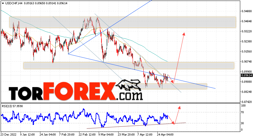 Таким образом, USD/CHF прогноз Доллар Франк на 2 мая 2023 предполагает попытку развития коррекции и теста области поддержки вблизи уровня 0.8905. Далее, продолжение роста валютной пары USD/CHF с целью выше уровня 0.9325. Дополнительным сигналом в пользу подъёма пары Доллар Франк выступит отскок от линии тренда на индикаторе относительной силы. Отменой варианта роста станет падение и пробой области 0.8795. Это укажет на пробой уровня поддержки и продолжение падения пары с потенциальной целью ниже уровня 0.8565.