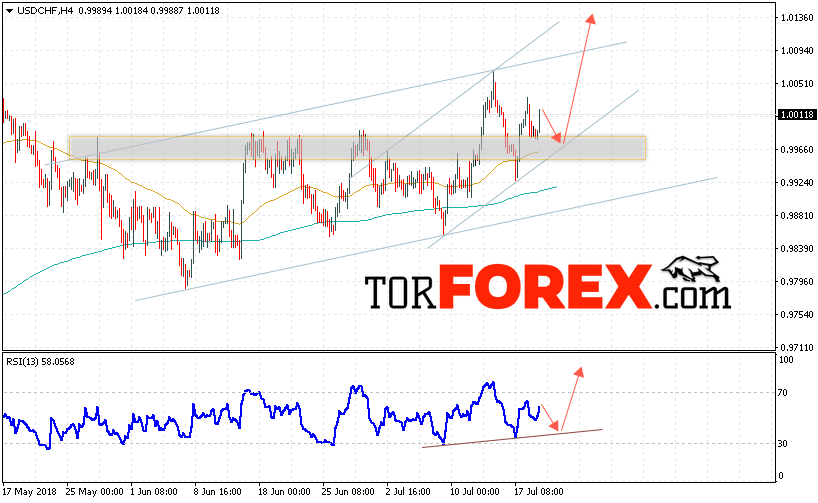 Таким образом, USD/CHF прогноз Доллар Франк на 20 июля 2018 предполагает попытку теста области поддержки вблизи уровня 0.9965 и продолжение роста пары USD/CHF с целью выше уровня 1.0135, дополнительным сигналом в пользу роста пары Доллар Франк выступит тест линии тренда на индикаторе относительной силы, отменой варианта роста станет падение и пробой области 0.9940, что укажет на пробой нижней границы восходящего канала и продолжение падения.