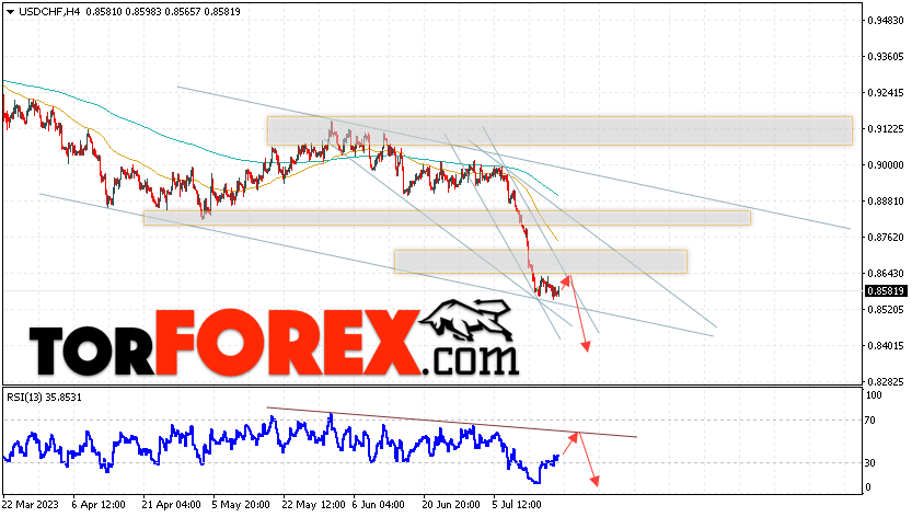 Таким образом, USD/CHF прогноз Доллар Франк на 20 июля 2023 предполагает попытку развития медвежьей коррекции и теста области сопротивления вблизи уровня 0.8605. Далее, продолжение падения валютной пары USD/CHF с целью ниже уровня 0.8395. Дополнительным сигналом в пользу снижения пары Доллар Франк выступит отскок от линии тренда на индикаторе относительной силы. Отменой варианта падения станет сильный рост и пробой области 0.8715. Это укажет на пробой уровня сопротивления и продолжение роста пары с потенциальной целью выше уровня 0.8965.