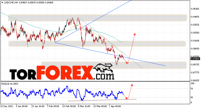 Таким образом, USD/CHF прогноз Доллар Франк на 21 апреля 2023 предполагает попытку развития коррекции и теста области поддержки вблизи уровня 0.8875. Далее, продолжение роста валютной пары USD/CHF с целью выше уровня 0.9265. Дополнительным сигналом в пользу подъёма пары Доллар Франк выступит отскок от линии тренда на индикаторе относительной силы. Отменой варианта роста станет падение и пробой области 0.8805. Это укажет на пробой уровня поддержки и продолжение падения пары с потенциальной целью ниже уровня 0.8625.