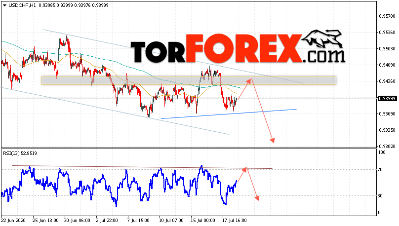 Таким образом, USD/CHF прогноз Доллар Франк на 21 июля 2020 предполагает попытку теста области сопротивления вблизи уровня 0.9445. Далее, продолжение падения валютной пары USD/CHF с целью ниже уровня 0.9325. Дополнительным сигналом в пользу падения пары Доллар Франк выступит тест линии тренда на индикаторе относительной силы. Отменой варианта снижения станет сильный рост и пробой области 0.9475. Это укажет на пробой уровня сопротивления и продолжение подъёма пары с потенциальной целью выше уровня 0.9685.