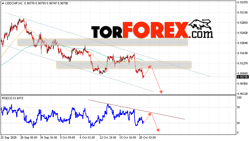Дополнительным сигналом в пользу падения валютной пары Доллар Франк на FOREX выступит тест линии тренда на индикаторе относительной силы. Вторым сигналом станет отскок от верхней гардины нисходящего канала. Отменой варианта падения пары USD/CHF на Форекс станет сильный рост и пробой области 0.9205. Это укажет на пробой области сопротивления и продолжение роста котировок USD/CHF в область выше уровня 0.9405. Ожидать подтверждение падения котировок USD/CHF стоит с пробоем области поддержки и закрытием ниже уровня 0.9025.