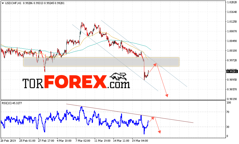 Таким образом, USD/CHF прогноз Доллар Франк на 22 марта 2019 предполагает попытку теста области сопротивления вблизи уровня 0.9965. Далее, продолжение падения пары USD/CHF с целью ниже уровня 0.9820. Дополнительным сигналом в пользу снижения пары Доллар Франк выступит тест линии сопротивления на индикаторе относительной силы. Отменой варианта падения станет сильный рост и пробой области 0.9995. Это укажет на пробой области сопротивления и продолжение роста пары.