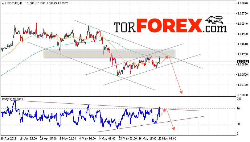 Таким образом, USD/CHF прогноз Доллар Франк на 22 мая 2019 предполагает попытку теста области сопротивления вблизи уровня 1.0120. Далее, продолжение падения валютной пары USD/CHF с целью ниже уровня 0.9985. Дополнительным сигналом в пользу падения пары Доллар Франк выступит тест линии тренда на индикаторе относительной силы. Отменой варианта снижения станет сильный рост и пробой области 1.0165. Это укажет на пробой уровня сопротивления и продолжение роста пары с потенциальной целью выше уровня 1.0235.