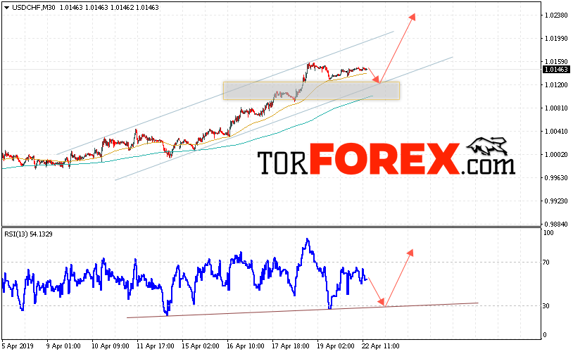 Таким образом, USD/CHF прогноз Доллар Франк на 23 апреля 2019 предполагает попытку теста области поддержки вблизи уровня 1.0125. Далее, продолжение роста пары USD/CHF с целью выше уровня 1.0245. Дополнительным сигналом в пользу роста пары Доллар Франк выступит тест линии поддержки на индикаторе относительной силы. Отменой варианта роста станет падение и пробой области 1.0085. Это укажет на пробой нижней границы восходящего канала и продолжение снижения пары с потенциальной целью ниже уровня 0.9995.
