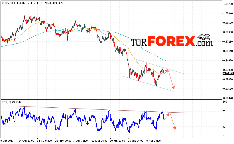 Таким образом, USD/CHF прогноз Доллар Франк на 23 февраля 2018 предполагает попытку теста верхней границы канала вблизи уровня 0.9380 и продолжение падения пары USD/CHF с целью ниже уровня 0.9150, дополнительным сигналом в пользу падения пары Доллар Франк выступит тест линии тренда на индикаторе относительной силы, отменой снижения станет сильный рост и пробой области 0.9420.