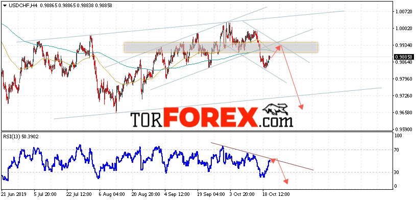 Таким образом, USD/CHF прогноз Доллар Франк на 23 октября 2019 предполагает попытку теста области сопротивления вблизи уровня 0.9935. Далее, продолжение падения валютной пары USD/CHF с целью ниже уровня 0.9665. Дополнительным сигналом в пользу снижения пары Доллар Франк выступит тест линии тренда на индикаторе относительной силы. Отменой варианта падения станет сильный рост и пробой области 0.9995. Это укажет на пробой уровня сопротивления и продолжение подъёма пары с потенциальной целью выше уровня 1.0125.