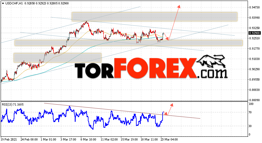 Таким образом, USD/CHF прогноз Доллар Франк на 24 марта 2021 предполагает попытку теста области поддержки вблизи уровня 0.9245. Далее, продолжение роста валютной пары USD/CHF с целью выше уровня 0.9475. Дополнительным сигналом в пользу подъёма пары Доллар Франк выступит тест линии тренда на индикаторе относительной силы. Отменой варианта роста станет падение и пробой области 0.9175. Это укажет на пробой уровня поддержки и продолжение снижения пары с потенциальной целью ниже уровня 0.8825.