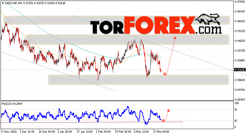 Таким образом, USD/CHF прогноз Доллар Франк на 24 марта 2023 предполагает попытку развития коррекции и теста области поддержки вблизи уровня 0.9075. Далее, продолжение роста валютной пары USD/CHF с целью ниже уровня 0.9425. Дополнительным сигналом в пользу подъёма пары Доллар Франк выступит отскок от линии тренда на индикаторе относительной силы. Отменой варианта роста станет падение и пробой области 0.9005. Это укажет на пробой уровня поддержки и продолжение падения пары с потенциальной целью ниже уровня 0.8735.