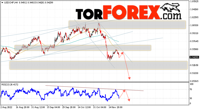 Таким образом, USD/CHF прогноз Доллар Франк на 24 ноября 2022 предполагает попытку развития коррекции и теста области сопротивления вблизи уровня 0.9535. Далее, продолжение падения валютной пары USD/CHF с целью ниже уровня 0.8935. Дополнительным сигналом в пользу снижения пары Доллар Франк выступит отскок от линии тренда на индикаторе относительной силы. Отменой варианта падения станет сильный рост и пробой области 0.9775. Это укажет на пробой уровня сопротивления и продолжение роста пары с потенциальной целью выше уровня 0.9995.