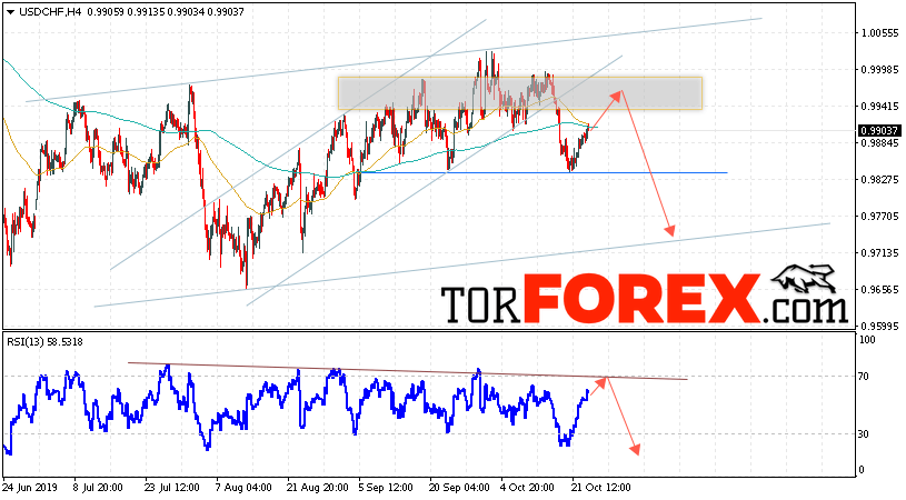Таким образом, USD/CHF прогноз Доллар Франк на 24 октября 2019 предполагает попытку теста области сопротивления вблизи уровня 0.9955. Далее, продолжение падения валютной пары USD/CHF с целью ниже уровня 0.9735. Дополнительным сигналом в пользу снижения пары Доллар Франк выступит тест линии тренда на индикаторе относительной силы. Отменой варианта падения станет сильный рост и пробой области 0.9995. Это укажет на пробой уровня сопротивления и продолжение подъёма пары с потенциальной целью выше уровня 1.0145.