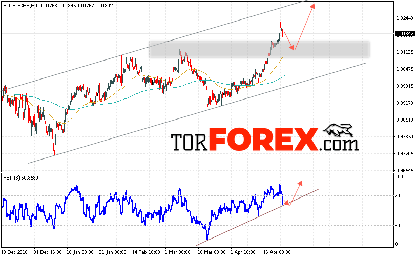 Таким образом, USD/CHF прогноз Доллар Франк на 25 апреля 2019 предполагает попытку теста области поддержки вблизи уровня 1.0115. Далее, продолжение роста пары USD/CHF с целью выше уровня 1.0325. Дополнительным сигналом в пользу роста пары Доллар Франк выступит тест линии поддержки на индикаторе относительной силы. Отменой варианта роста станет падение и пробой области 1.0045. Это укажет на пробой нижней границы восходящего канала и продолжение снижения пары с потенциальной целью ниже уровня 0.9995.