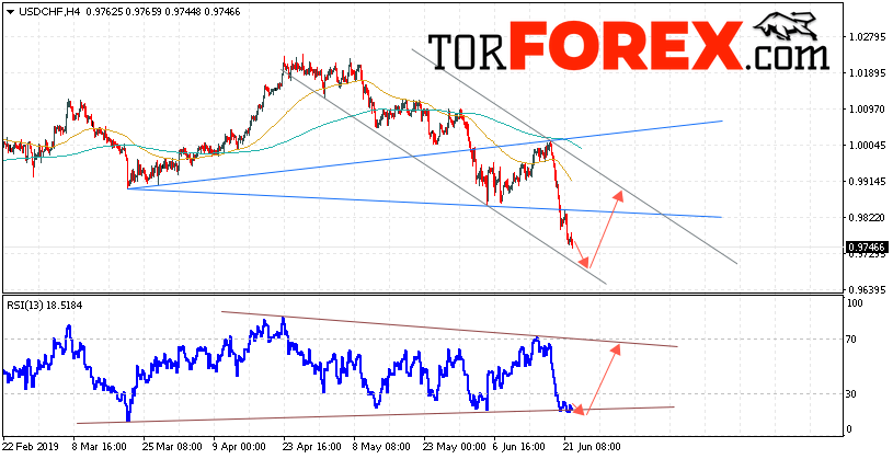 Таким образом, USD/CHF прогноз Доллар Франк на 25 июня 2019 предполагает попытку теста области поддержки вблизи уровня 0.9705. Далее, продолжение роста валютной пары USD/CHF с целью выше уровня 0.9875. Дополнительным сигналом в пользу подъёма пары Доллар Франк выступит тест линии поддержки на индикаторе относительной силы. Отменой варианта роста станет падение и пробой области 0.9645. Это укажет на пробой уровня поддержки и продолжение роста пары с потенциальной целью ниже уровня 0.9505.