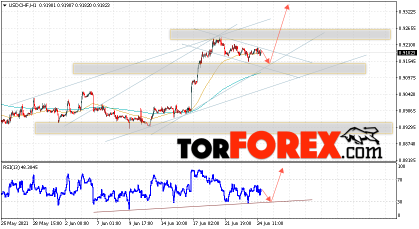 Таким образом, USD/CHF прогноз Доллар Франк на 25 июня 2021 предполагает попытку теста области поддержки вблизи уровня 0.9155. Далее, продолжение роста валютной пары USD/CHF с целью выше уровня 0.9335. Дополнительным сигналом в пользу подъёма пары Доллар Франк выступит тест линии тренда на индикаторе относительной силы. Отменой варианта подъёма станет падение и пробой области 0.9025. Это укажет на пробой уровня поддержки и продолжение снижения пары с потенциальной целью ниже уровня 0.8755.