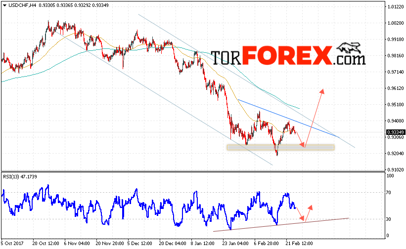 Таким образом, USD/CHF прогноз Доллар Франк на 27 февраля 2018 предполагает попытку теста области поддержки вблизи уровня 0.9250 и продолжение роста пары USD/CHF с целью выше уровня 0.9610, дополнительным сигналом в пользу роста пары Доллар Франк выступит тест линии тренда на индикаторе относительной силы, отменой роста станет падение и пробой области 0.9180.
