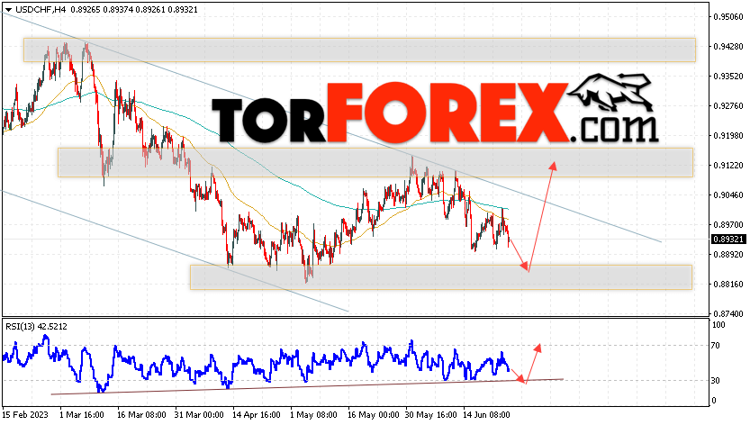 Таким образом, USD/CHF прогноз Доллар Франк на 27 июня 2023 предполагает попытку развития коррекции и теста области поддержки вблизи уровня 0.8885. Далее, продолжение роста валютной пары USD/CHF с целью ниже уровня 0.9125. Дополнительным сигналом в пользу подъёма пары Доллар Франк выступит отскок от линии тренда на индикаторе относительной силы. Отменой варианта роста станет падение и пробой области 0.8785. Это укажет на пробой уровня поддержки и продолжение падения пары с потенциальной целью ниже уровня 0.8525.