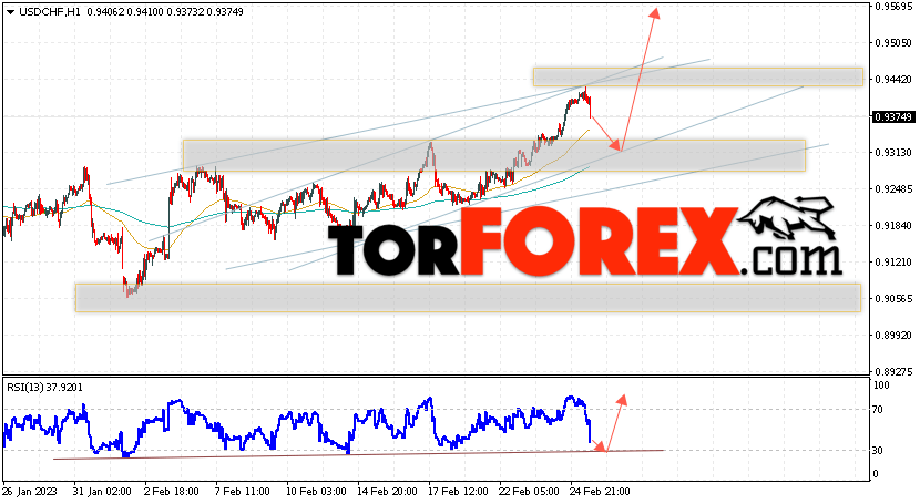 Таким образом, USD/CHF прогноз Доллар Франк на 28 февраля 2023 предполагает попытку развития коррекции и теста области поддержки вблизи уровня 0.9315. Далее, продолжение роста валютной пары USD/CHF с целью выше уровня 0.9565. Дополнительным сигналом в пользу подъёма пары Доллар Франк выступит отскок от линии тренда на индикаторе относительной силы. Отменой варианта роста станет падение и пробой области 0.9205. Это укажет на пробой уровня поддержки и продолжение снижения пары с потенциальной целью ниже уровня 0.8915.
