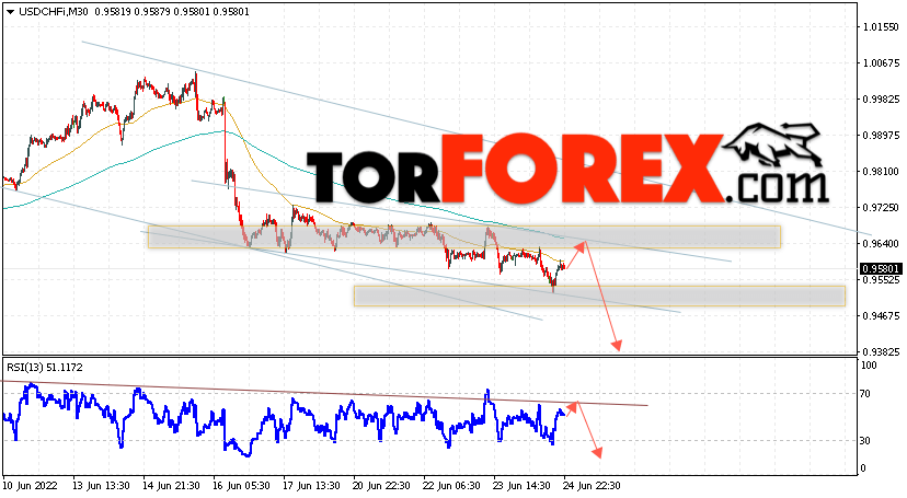 Таким образом, USD/CHF прогноз Доллар Франк на 28 июня 2022 предполагает попытку теста области сопротивления вблизи уровня 0.9640. Далее, продолжение падения валютной пары USD/CHF с целью ниже уровня 0.9375. Дополнительным сигналом в пользу снижения пары Доллар Франк выступит отскок от линии тренда на индикаторе относительной силы. Отменой варианта падения станет сильный рост и пробой области 0.9735. Это укажет на пробой уровня сопротивления и продолжение роста пары с потенциальной целью выше уровня 0.9885.