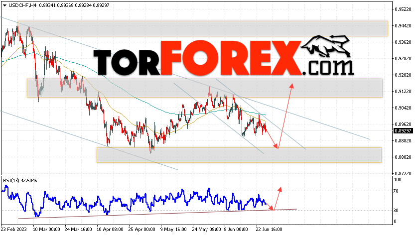 Таким образом, USD/CHF прогноз Доллар Франк на 28 июня 2023 предполагает попытку развития коррекции и теста области поддержки вблизи уровня 0.8845. Далее, продолжение роста валютной пары USD/CHF с целью ниже уровня 0.9145. Дополнительным сигналом в пользу подъёма пары Доллар Франк выступит отскок от линии тренда на индикаторе относительной силы. Отменой варианта роста станет падение и пробой области 0.8745. Это укажет на пробой уровня поддержки и продолжение падения пары с потенциальной целью ниже уровня 0.8505.