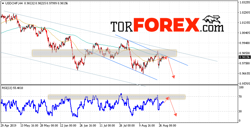 Таким образом, USD/CHF прогноз Доллар Франк на 29 августа 2019 предполагает попытку теста области сопротивления вблизи уровня 0.9855. Далее, продолжение падения валютной пары USD/CHF с целью ниже уровня 0.9575. Дополнительным сигналом в пользу снижения пары Доллар Франк выступит тест линии тренда на индикаторе относительной силы. Отменой варианта падения станет сильный рост и пробой области 0.9945. Это укажет на пробой уровня сопротивления и продолжение роста пары с потенциальной целью выше уровня 1.0155.