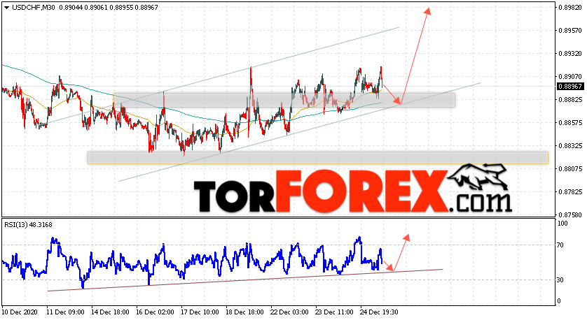 Таким образом, USD/CHF прогноз Доллар Франк на 29 декабря 2020 предполагает попытку теста области поддержки вблизи уровня 0.8865. Далее, продолжение роста валютной пары USD/CHF с целью выше уровня 0.8985. Дополнительным сигналом в пользу подъёма пары Доллар Франк выступит тест линии тренда на индикаторе относительной силы. Отменой варианта роста станет падение и пробой области 0.8845. Это укажет на пробой уровня поддержки и продолжение падения пары с потенциальной целью ниже уровня 0.8765.