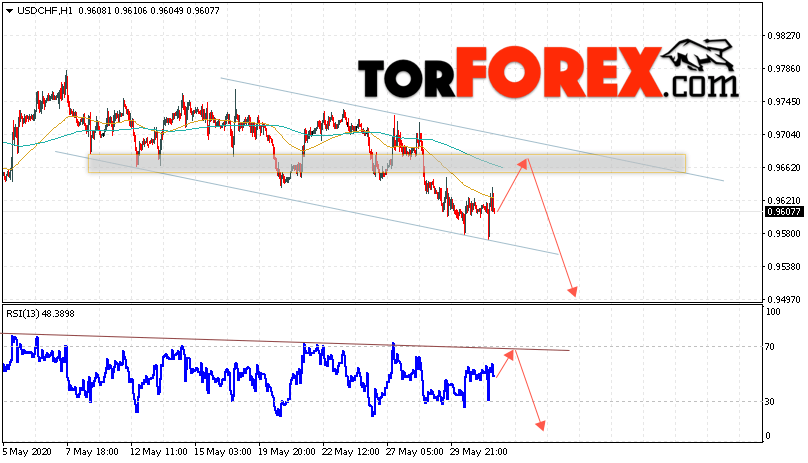 Таким образом, USD/CHF прогноз Доллар Франк на 3 июня 2020 предполагает попытку теста области сопротивления вблизи уровня 0.9655. Далее, продолжение падения валютной пары USD/CHF с целью ниже уровня 0.9495. Дополнительным сигналом в пользу падения пары Доллар Франк выступит тест линии тренда на индикаторе относительной силы. Отменой варианта падения станет сильный рост и пробой области 0.9745. Это укажет на пробой уровня сопротивления и продолжение роста пары с потенциальной целью выше уровня 0.9975.