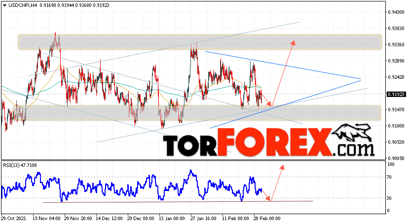 Таким образом, USD/CHF прогноз Доллар Франк на 3 марта 2022 предполагает попытку теста области поддержки вблизи уровня 0.9155. Далее, продолжение роста валютной пары USD/CHF с целью выше уровня 0.9375. Дополнительным сигналом в пользу роста пары Доллар Франк выступит тест бычьей линии тренда на индикаторе относительной силы. Отменой варианта подъёма станет падение и пробой области 0.9085. Это укажет на пробой уровня поддержки и продолжение снижения пары с потенциальной целью ниже уровня 0.8705.