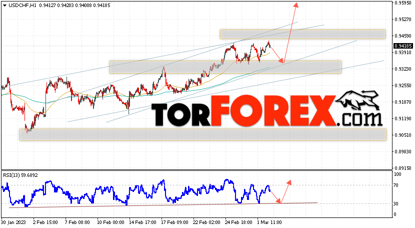 Таким образом, USD/CHF прогноз Доллар Франк на 3 марта 2023 предполагает попытку развития коррекции и теста области поддержки вблизи уровня 0.9345. Далее, продолжение роста валютной пары USD/CHF с целью выше уровня 0.9595. Дополнительным сигналом в пользу подъёма пары Доллар Франк выступит отскок от линии тренда на индикаторе относительной силы. Отменой варианта роста станет падение и пробой области 0.9265. Это укажет на пробой уровня поддержки и продолжение снижения пары с потенциальной целью ниже уровня 0.8915.