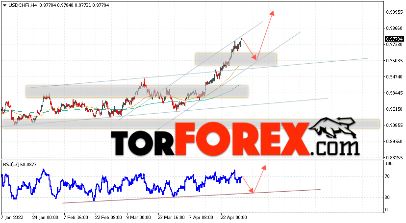 Таким образом, USD/CHF прогноз Доллар Франк на 3 мая 2022 предполагает попытку теста области поддержки вблизи уровня 0.9610. Далее, продолжение роста валютной пары USD/CHF с целью выше уровня 0.9955. Дополнительным сигналом в пользу роста пары Доллар Франк выступит тест бычьей линии тренда на индикаторе относительной силы. Отменой варианта подъёма станет падение и пробой области 0.9575. Это укажет на пробой уровня поддержки и продолжение снижения пары с потенциальной целью ниже уровня 0.9435.
