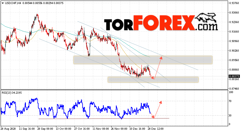 Таким образом, USD/CHF прогноз Доллар Франк на 30 декабря 2020 предполагает попытку теста области поддержки вблизи уровня 0.8825. Далее, продолжение роста валютной пары USD/CHF с целью выше уровня 0.8985. Дополнительным сигналом в пользу подъёма пары Доллар Франк выступит тест линии тренда на индикаторе относительной силы. Отменой варианта роста станет падение и пробой области 0.8785. Это укажет на пробой уровня поддержки и продолжение падения пары с потенциальной целью ниже уровня 0.8645.