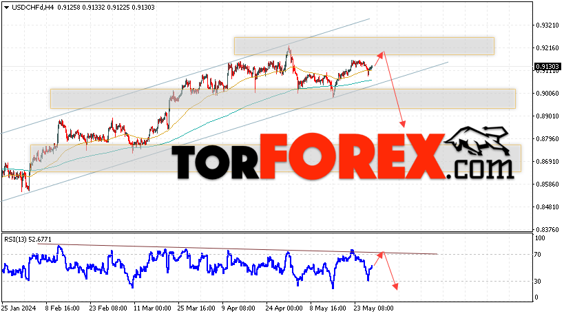 Таким образом, USD/CHF прогноз Доллар Франк на 30 мая 2024 предполагает попытку развития развития бычьей коррекции и теста области сопротивления вблизи уровня 0.9155. Далее, продолжение падения валютной пары USD/CHF с целью ниже уровня 0.8875. Дополнительным сигналом в пользу снижения пары Доллар Франк выступит отскок от линии тренда на индикаторе относительной силы. Отменой варианта падения станет сильный рост и пробой области 0.9265. Это укажет на пробой уровня сопротивления и продолжение подъёма пары с потенциальной целью выше уровня 0.9415.