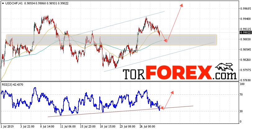 Таким образом, USD/CHF прогноз Доллар Франк на 31 июля 2019 предполагает попытку теста области поддержки вблизи уровня 0.9870. Далее, продолжение роста валютной пары USD/CHF с целью выше уровня 1.0005. Дополнительным сигналом в пользу подъёма пары Доллар Франк выступит тест восходящей линии тренда на индикаторе относительной силы. Отменой варианта роста станет сильное падение и пробой области 0.9815. Это укажет на пробой уровня поддержки и продолжение роста пары с потенциальной целью ниже уровня 0.9725.