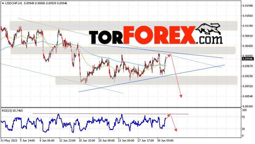Таким образом, USD/CHF прогноз Доллар Франк на 4 июля 2023 предполагает попытку развития коррекции и теста области сопротивления вблизи уровня 0.9000. Далее, продолжение падения валютной пары USD/CHF с целью выше уровня 0.8855. Дополнительным сигналом в пользу снижения пары Доллар Франк выступит отскок от линии тренда на индикаторе относительной силы. Отменой варианта падения станет сильный рост и пробой области 0.9065. Это укажет на пробой уровня сопротивления и продолжение роста пары с потенциальной целью выше уровня 0.9235.