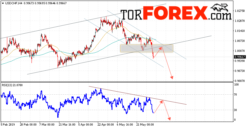 Таким образом, USD/CHF прогноз Доллар Франк на 4 июня 2019 предполагает попытку теста области сопротивления вблизи уровня 1.0015. Далее, продолжение падения валютной пары USD/CHF с целью ниже уровня 0.9805. Дополнительным сигналом в пользу падения пары Доллар Франк выступит тест линии тренда на индикаторе относительной силы. Отменой варианта снижения станет сильный рост и пробой области 1.0085. Это укажет на пробой уровня сопротивления и продолжение роста пары с потенциальной целью выше уровня 1.0165.