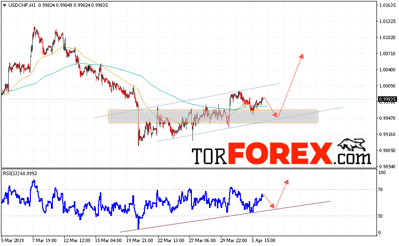 Таким образом, USD/CHF прогноз Доллар Франк на 5 апреля 2019 предполагает попытку теста области поддержки вблизи уровня 0.9945. Далее, продолжение роста пары USD/CHF с целью выше уровня 1.0070. Дополнительным сигналом в пользу роста пары Доллар Франк выступит тест линии поддержки на индикаторе относительной силы. Отменой варианта роста станет падение и пробой области 0.9915. Это укажет на пробой области поддержки и продолжение снижения пары.