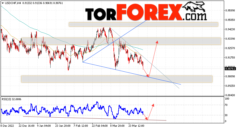 Таким образом, USD/CHF прогноз Доллар Франк на 5 апреля 2023 предполагает попытку развития коррекции и теста области поддержки вблизи уровня 0.9005. Далее, продолжение роста валютной пары USD/CHF с целью ниже уровня 0.9275. Дополнительным сигналом в пользу подъёма пары Доллар Франк выступит отскок от линии тренда на индикаторе относительной силы. Отменой варианта роста станет падение и пробой области 0.8804. Это укажет на пробой уровня поддержки и продолжение падения пары с потенциальной целью ниже уровня 0.8715.