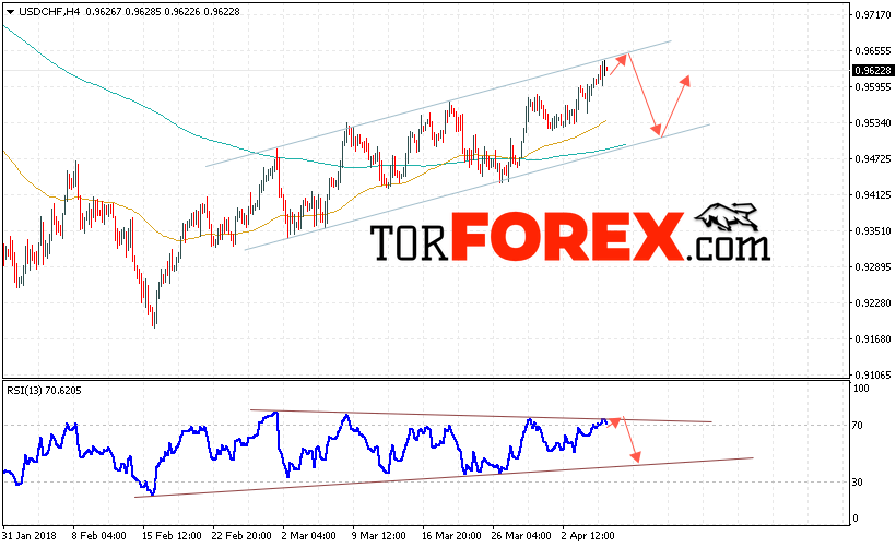 Таким образом, USD/CHF прогноз Доллар Франк на 6 апреля 2018 предполагает попытку теста верхней границы канала вблизи уровня 0.9650 и продолжение падения пары USD/CHF с целью ниже уровня 0.9505, дополнительным сигналом в пользу падения пары Доллар Франк выступит тест линии тренда на индикаторе относительной силы, отменой варианта падения станет сильный рост и пробой области 0.9680.