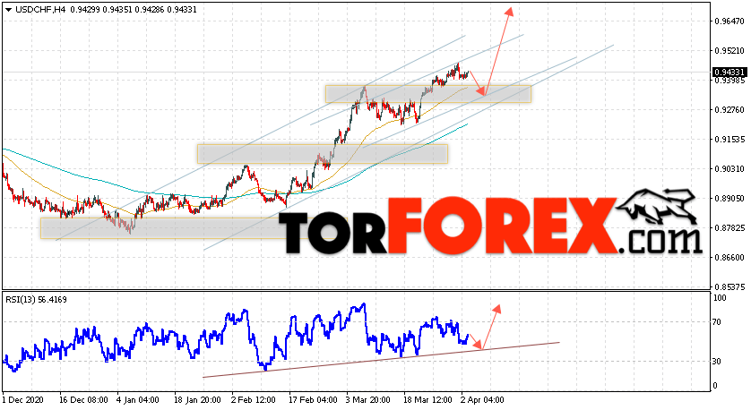 Таким образом, USD/CHF прогноз Доллар Франк на 6 апреля 2021 предполагает попытку теста области поддержки вблизи уровня 0.9335. Далее, продолжение роста валютной пары USD/CHF с целью выше уровня 0.9685. Дополнительным сигналом в пользу подъёма пары Доллар Франк выступит тест линии тренда на индикаторе относительной силы. Отменой варианта роста станет падение и пробой области 0.9225. Это укажет на пробой уровня поддержки и продолжение снижения пары с потенциальной целью ниже уровня 0.8865.
