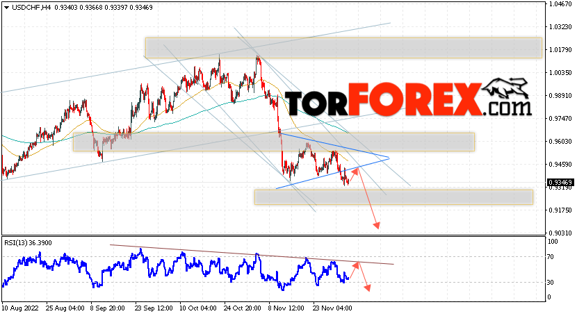 Таким образом, USD/CHF прогноз Доллар Франк на 6 декабря 2022 предполагает попытку развития коррекции и теста области сопротивления вблизи уровня 0.9445. Далее, продолжение падения валютной пары USD/CHF с целью выше уровня 0.9035. Дополнительным сигналом в пользу снижения пары Доллар Франк выступит отскок от линии тренда на индикаторе относительной силы. Отменой варианта падения станет сильный рост и пробой области 0.9665. Это укажет на пробой уровня сопротивления и продолжение подъёма пары с потенциальной целью выше уровня 0.9895.