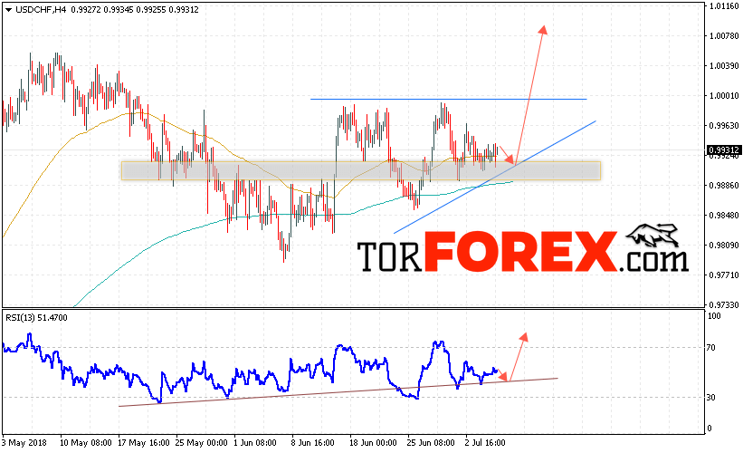 Таким образом, USD/CHF прогноз Доллар Франк на 5 июля 2018 предполагает попытку теста области поддержки вблизи уровня 0.9920 и продолжение роста пары USD/CHF с целью выше уровня 1.0070, дополнительным сигналом в пользу роста пары Доллар Франк выступит тест линии тренда на индикаторе относительной силы, отменой варианта роста станет падение и пробой области 0.9860, что укажет на пробой нижней границы модели «Треугольник».