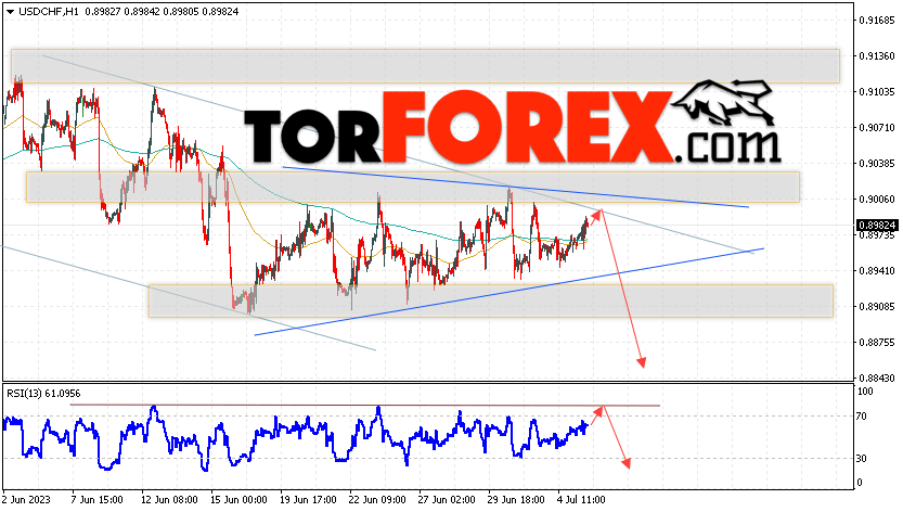 Таким образом, USD/CHF прогноз Доллар Франк на 6 июля 2023 предполагает попытку развития коррекции и теста области сопротивления вблизи уровня 0.9005. Далее, продолжение падения валютной пары USD/CHF с целью выше уровня 0.8865. Дополнительным сигналом в пользу снижения пары Доллар Франк выступит отскок от линии тренда на индикаторе относительной силы. Отменой варианта падения станет сильный рост и пробой области 0.9055. Это укажет на пробой уровня сопротивления и продолжение роста пары с потенциальной целью выше уровня 0.9245.