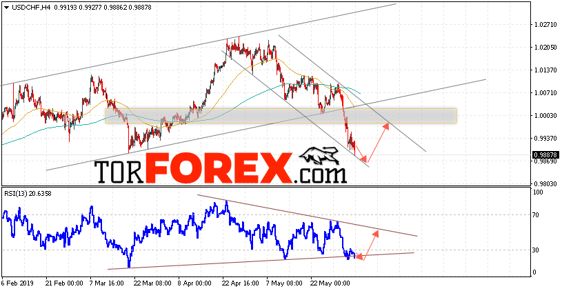 Таким образом, USD/CHF прогноз Доллар Франк на 6 июня 2019 предполагает попытку теста области поддержки вблизи уровня 0.9865. Далее, продолжение роста валютной пары USD/CHF с целью выше уровня 1.0000. Дополнительным сигналом в пользу подъёма пары Доллар Франк выступит тест линии поддержки на индикаторе относительной силы. Отменой варианта роста станет падение и пробой области 0.9835. Это укажет на пробой уровня поддержки и продолжение снижения пары с потенциальной целью ниже уровня 0.9725.