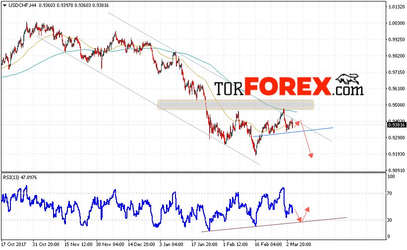 Таким образом, USD/CHF прогноз Доллар Франк на 7 марта 2018 предполагает попытку теста области сопротивления вблизи уровня 0.9410 и продолжение падения пары USD/CHF с целью ниже уровня 0.9195, дополнительным сигналом в пользу падения пары Доллар Франк выступит тест линии тренда на индикаторе относительной силы, отменой варианта падения станет сильный рост и пробой области 0.9510.