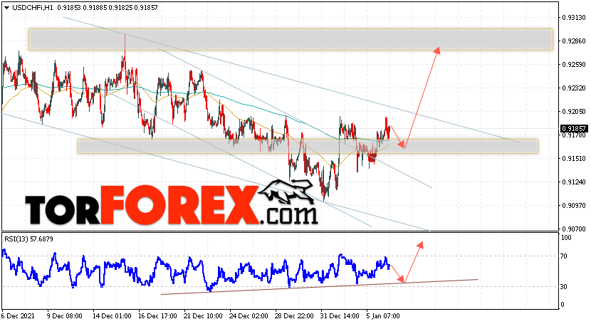 Таким образом, USD/CHF прогноз Доллар Франк на 7 января 2022 предполагает попытку теста области поддержки вблизи уровня 0.9165. Далее, продолжение роста валютной пары USD/CHF с целью выше уровня 0.9275. Дополнительным сигналом в пользу роста пары Доллар Франк выступит тест бычьей линии тренда на индикаторе относительной силы. Отменой варианта подъёма станет падение и пробой области 0.9085. Это укажет на пробой уровня поддержки и продолжение снижения пары с потенциальной целью ниже уровня 0.8835.