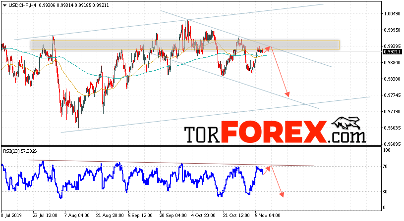 Таким образом, USD/CHF прогноз Доллар Франк на 8 ноября 2019 предполагает попытку теста области сопротивления вблизи уровня 0.9950. Далее, продолжение падения валютной пары USD/CHF с целью ниже уровня 0.9775. Дополнительным сигналом в пользу снижения пары Доллар Франк выступит тест линии тренда на индикаторе относительной силы. Отменой варианта падения станет сильный рост и пробой области 1.0005. Это укажет на пробой уровня сопротивления и продолжение подъёма пары с потенциальной целью выше уровня 1.0205.