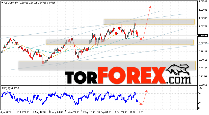 Таким образом, USD/CHF прогноз Доллар Франк на 8 ноября 2022 предполагает попытку развития коррекции и теста области поддержки вблизи уровня 0.9795. Далее, продолжение роста валютной пары USD/CHF с целью выше уровня 1.0385. Дополнительным сигналом в пользу подъёма пары Доллар Франк выступит отскок от линии тренда на индикаторе относительной силы. Отменой варианта роста станет падение и пробой области 0.9695. Это укажет на пробой уровня поддержки и продолжение падения пары с потенциальной целью ниже уровня 0.9405.