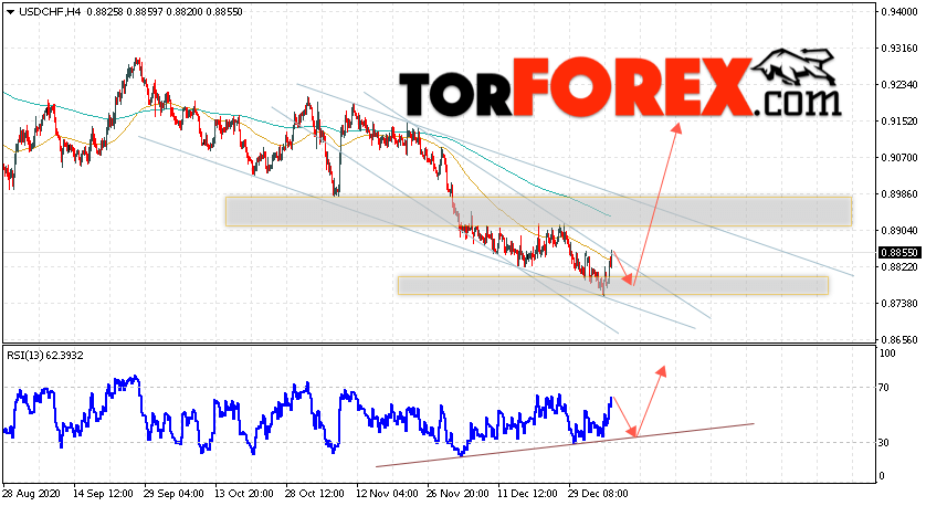 Таким образом, USD/CHF прогноз Доллар Франк на 8 января 2021 предполагает попытку теста области поддержки вблизи уровня 0.8795. Далее, продолжение роста валютной пары USD/CHF с целью выше уровня 0.9165. Дополнительным сигналом в пользу подъёма пары Доллар Франк выступит тест линии тренда на индикаторе относительной силы. Отменой варианта роста станет падение и пробой области 0.8705. Это укажет на пробой уровня поддержки и продолжение падения пары с потенциальной целью ниже уровня 0.8525.