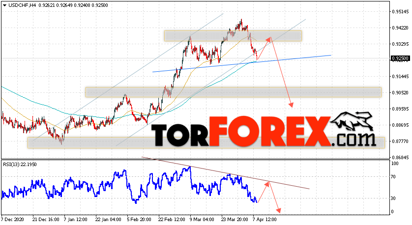 Таким образом, USD/CHF прогноз Доллар Франк на 9 апреля 2021 предполагает попытку теста области сопротивления вблизи уровня 0.9355. Далее, продолжение падения валютной пары USD/CHF с целью ниже уровня 0.8965. Дополнительным сигналом в пользу падения пары Доллар Франк выступит тест линии тренда на индикаторе относительной силы. Отменой варианта падения станет сильный рост и пробой области 0.9535. Это укажет на пробой уровня сопротивления и продолжение подъёма пары с потенциальной целью выше уровня 0.9765.
