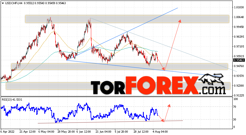 Таким образом, USD/CHF прогноз Доллар Франк на 9 августа 2022 предполагает попытку теста области поддержки вблизи уровня 0.9465. Далее, продолжение роста валютной пары USD/CHF с целью выше уровня 0.9975. Дополнительным сигналом в пользу подъёма пары Доллар Франк выступит отскок от линии тренда на индикаторе относительной силы. Отменой варианта роста станет падение и пробой области 0.9295. Это укажет на пробой уровня поддержки и продолжение падения пары с потенциальной целью ниже уровня 0.9075.